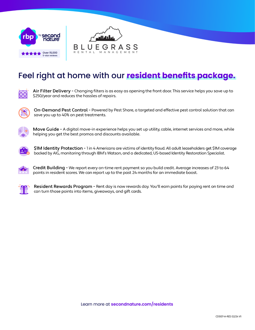 At Bluegrass Rental Management, we strive to provide an experience that is cost-effective and convenient. That’s why we provide a Resident Benefits Package (RBP) to address common headaches for our residents and provide must-have services for our renters. The Total Monthly Price of $1,293 includes rent and utility fee (water,sewer,trash), plus pest control, air filter delivery, utility setup assistance, credit building and more at a rate of $39.00/ month, required with the rental. Residents have the option to personalize some components during onboarding, which may increase or decrease the monthly amount. In addition to RBP, we provide access to liability insurance that meets your needs. More details upon application.